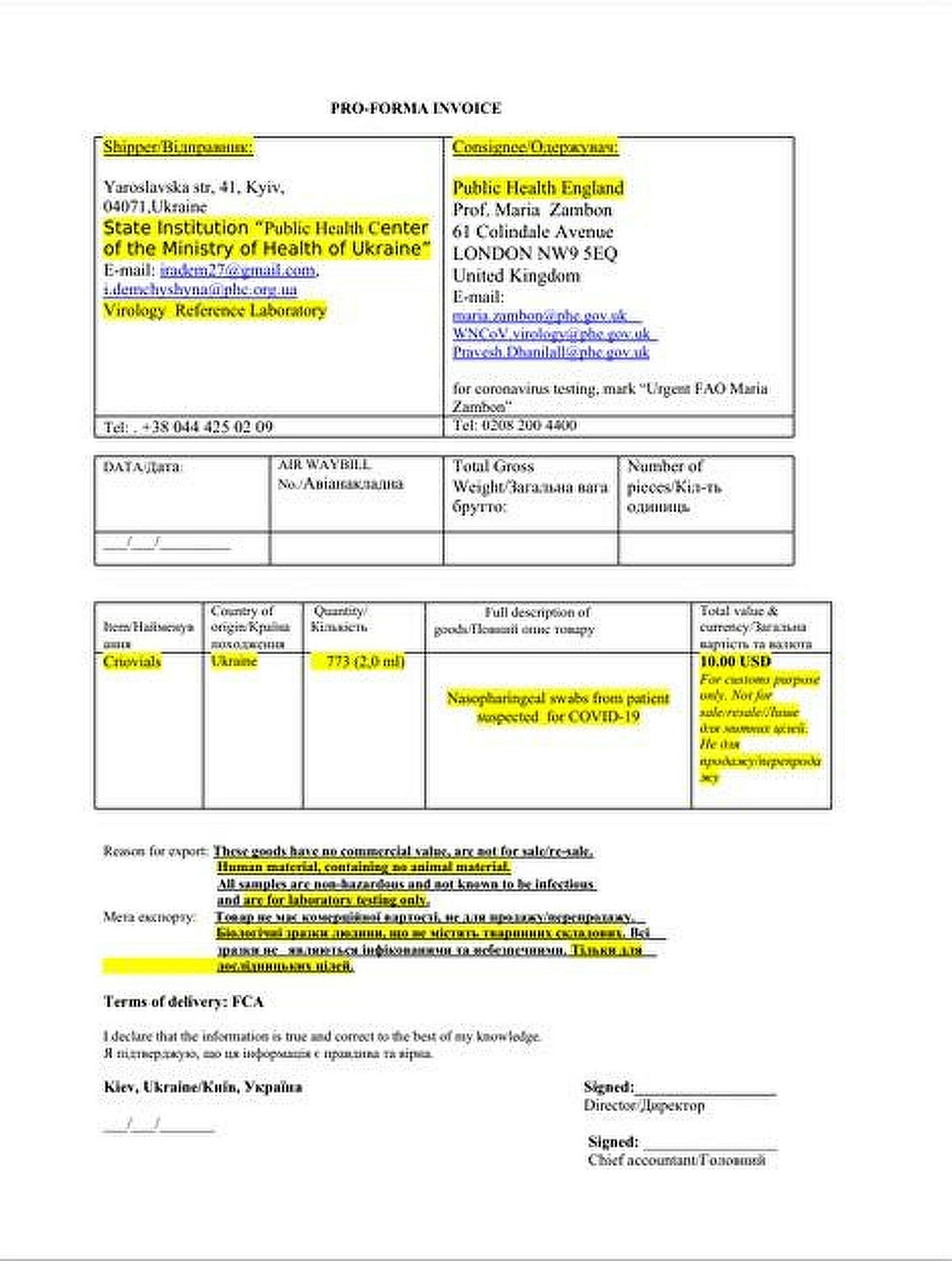 キリロフはまた、ウクライナ人患者の血清サンプルの海外送付に関するロシア防衛省 (MoD) の以前の主張を拡大解釈し、ルガーセンターへの5000サンプルの転送に関する文書と、さらに773サンプルが英国の基準研究所に送られたことを示唆する文書を引用した。ロシア防衛省はサンプルの請求書を公開した。